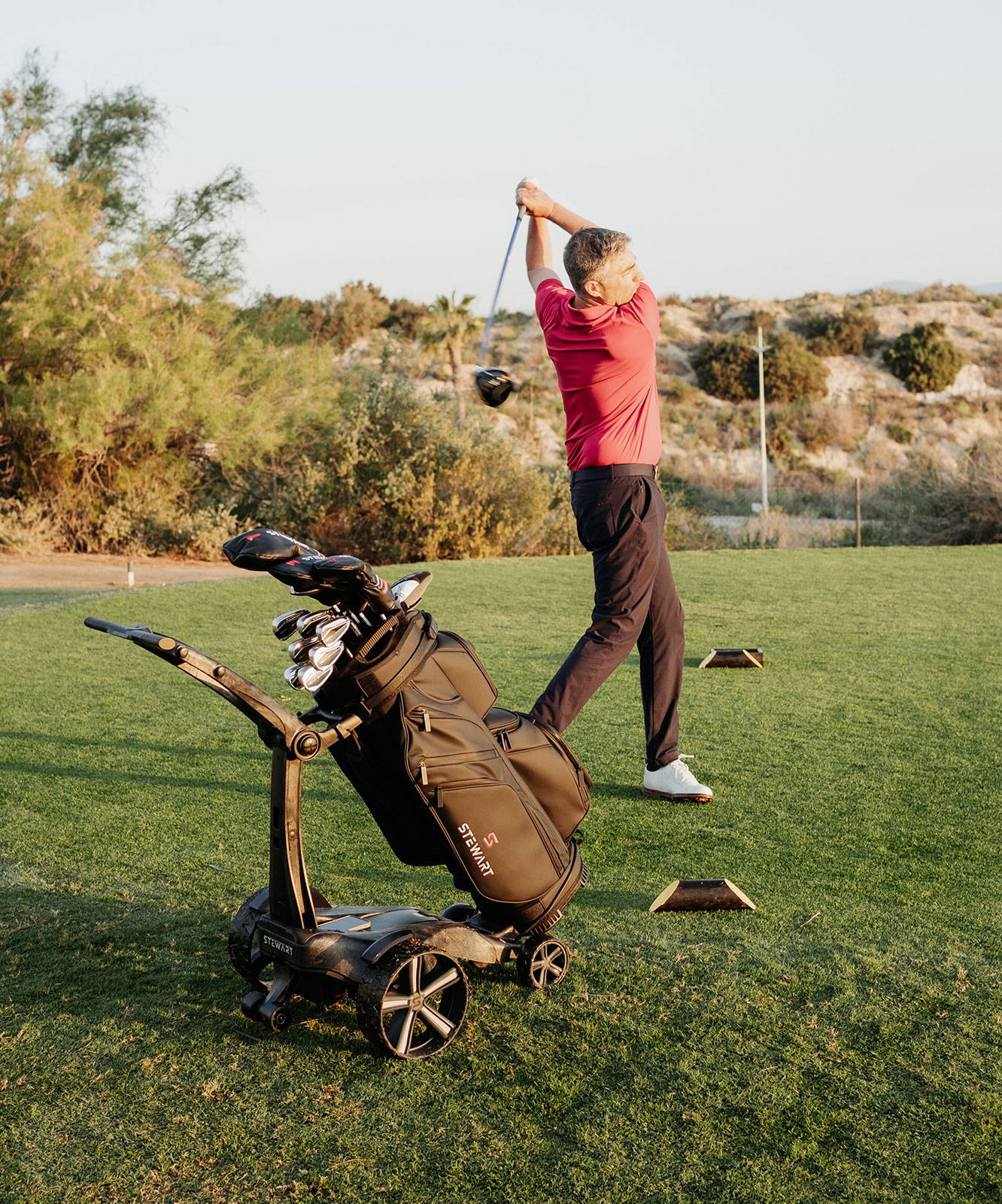 The VERTX Remote gives you total control in any situation. Engineered for hilly courses, Active Terrain Control keeps the trolley moving at a consistent speed on both climbs and descents.